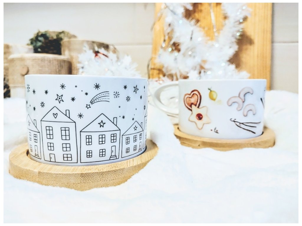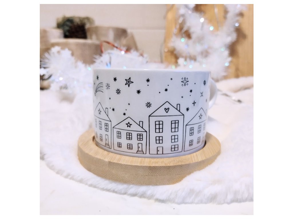Keramický hrnek s bambusovým podtáckem, objem 200ml s s motivy zimy a domečků ,natištěného po celém obvodu hrnečku. Vytištěno a vymyšleno v dílně Hrdě tvořím.